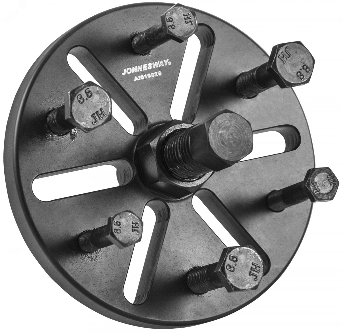 Съемник приводных деталей, шкивов, маховиков двигателя автомобиля, в котором в качестве захватов используются болты, устанавливаемые в технологические резьбовые отверстия демонтируемой детали. Применяется для демонтажа зубчатых колес приводов ГРМ, водяного насоса автомобилей TOYOTA, FORD и аналогичных.