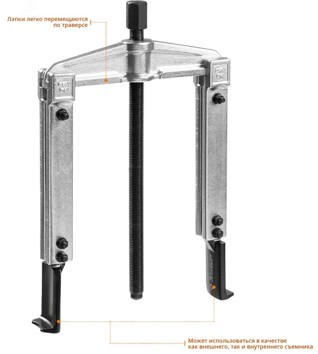 Захваты съемника выкованы из качественной инструментальной стали, что обеспечивает долгий срок службы при работе с высокими нагрузками. Позволяет работать с широким рядом узлов. Уменьшенные по толщине захваты дают возможность работать в условиях ограниченного пространства.