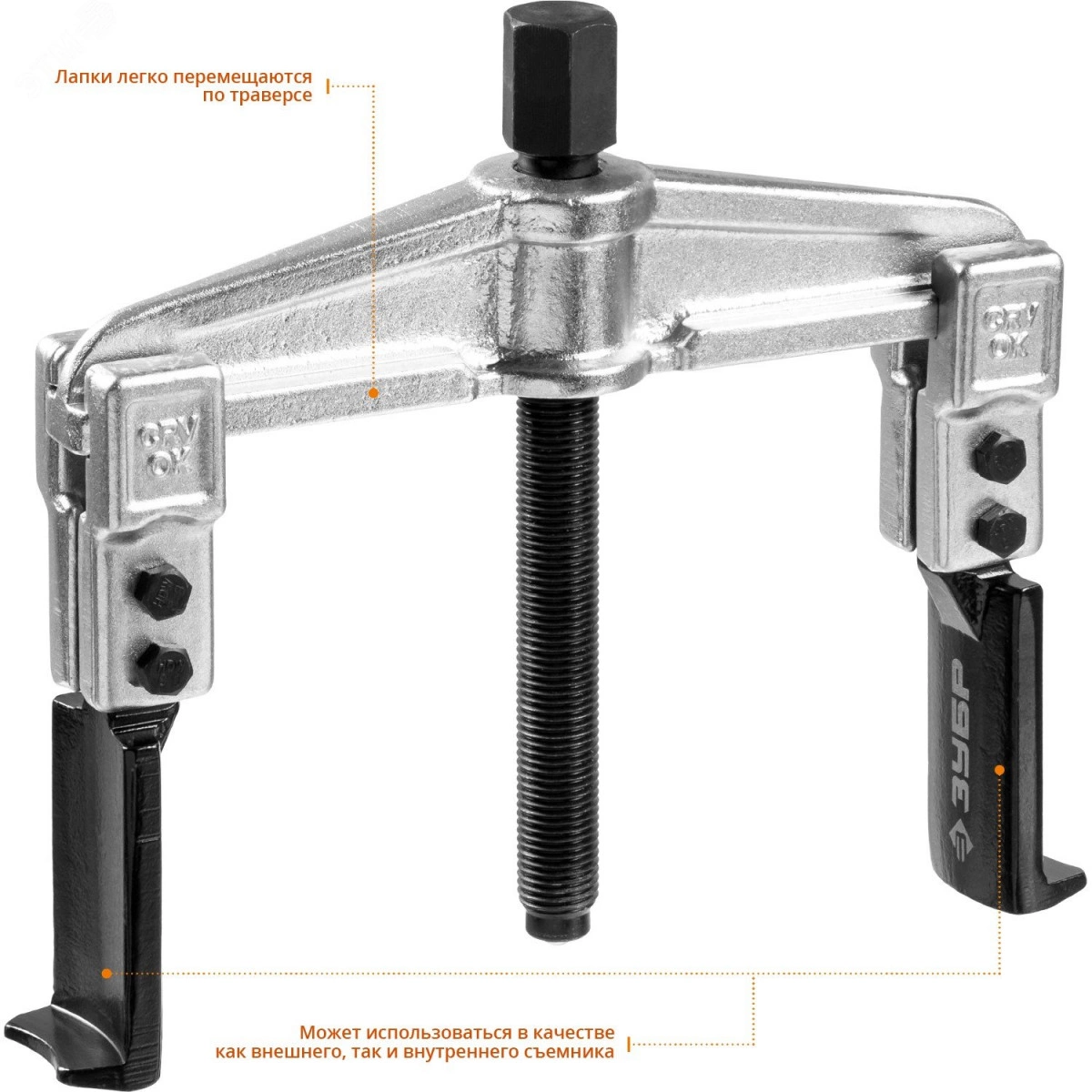 Захваты съемника выкованы из качественной инструментальной стали, что обеспечивает долгий срок службы при работе с высокими нагрузками. Позволяет работать с широким рядом узлов. Уменьшенные по толщине захваты дают возможность работать в условиях ограниченного пространства.