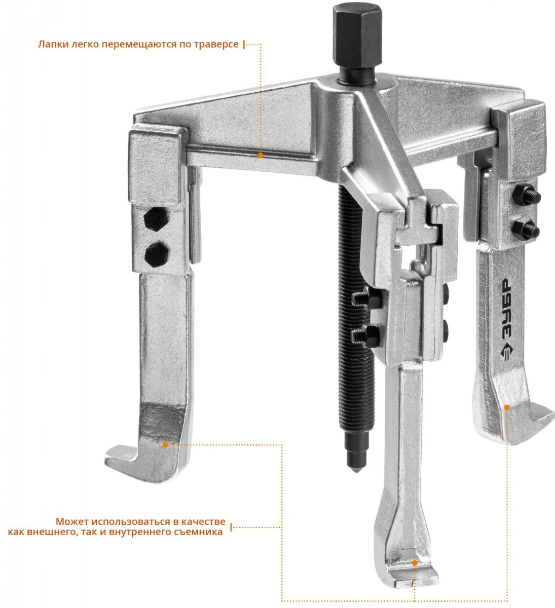 Захваты съемника выкованы из качественной инструментальной стали, что обеспечивает долгий срок службы при работе с высокими нагрузками. Позволяет работать с широким рядом узлов.
