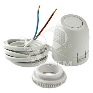 "Привод для автоматического управления радиаторным или коллекторным термостатическим клапаном систем водяного отопления (водяной теплый пол) и охлаждения зданий по сигналу от термостата, датчика или контроллера. Действие основано на расширении заполняющего сильфон армированного парафина при протекании электрического тока через встроенный нагревательный элемент. Нормально открытый. Присоединение сервопривода к клапану - через переходник (в комплекте).