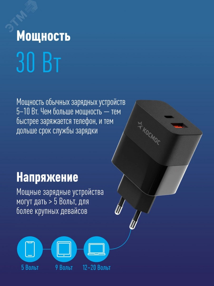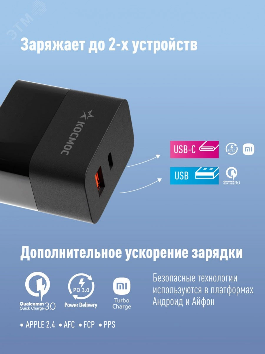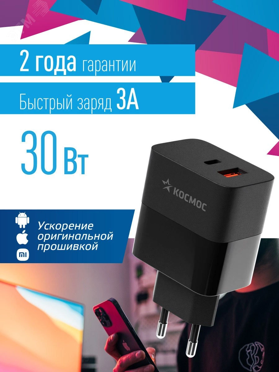 Сетевое зарядное устройство с разъемами Type-C и USB мощностью 30Вт. Поддержка PD3.0, QC3.0, быстрая зарядка Samsung AFC и другие протоколы быстрой зарядки. Подходит для любых современных гаджетов от смартфонов до ноутбуков.
