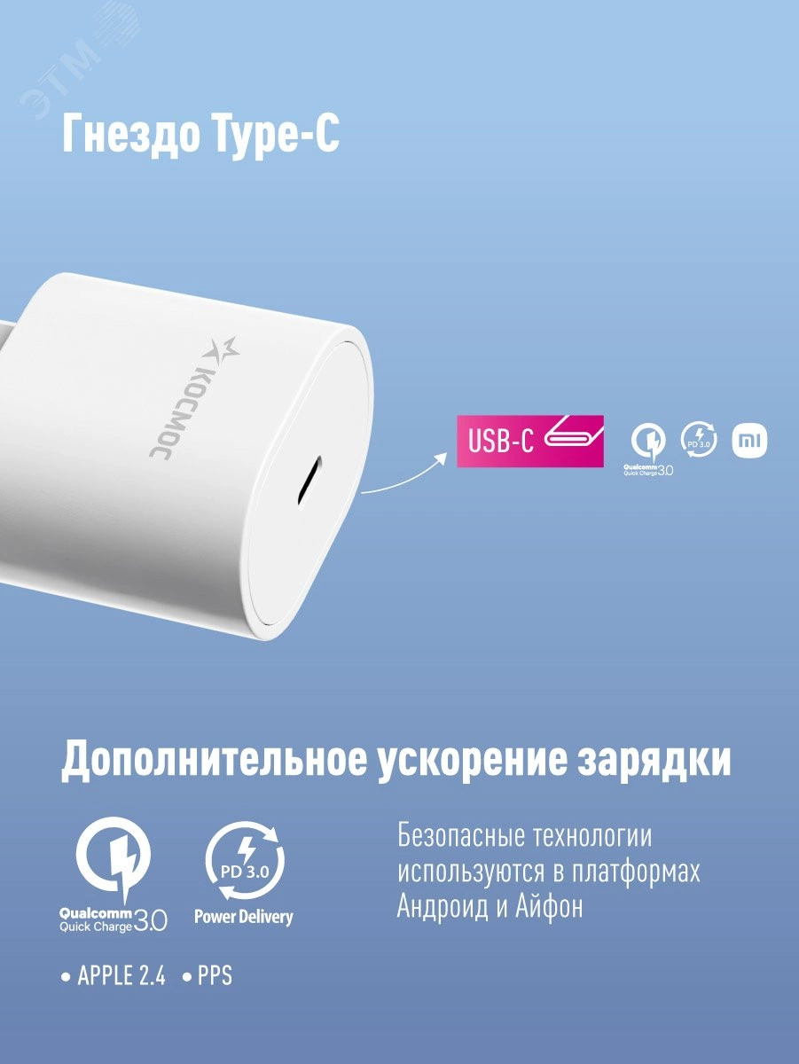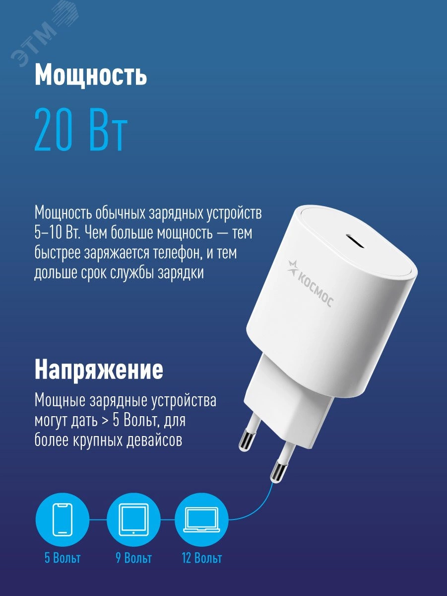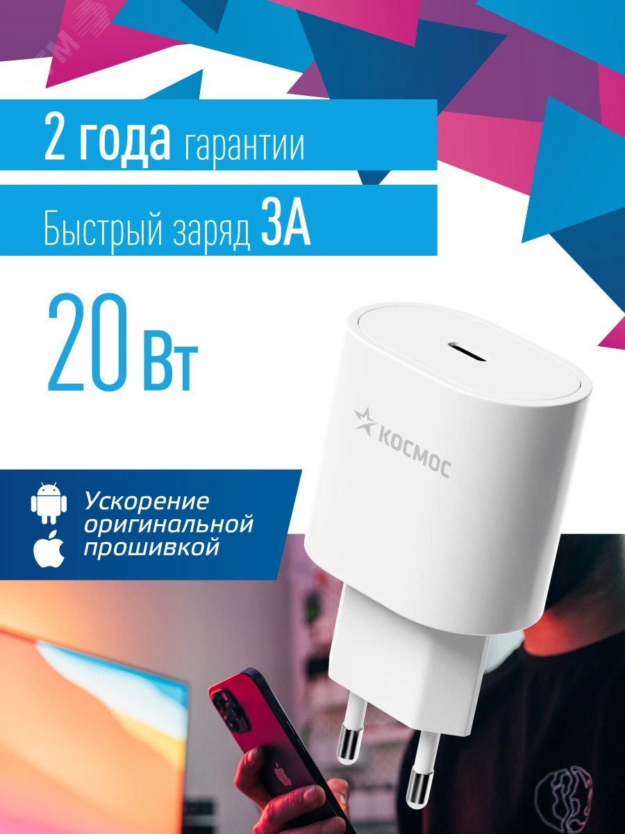 Сетевое зарядное устройство с разъемом Type-C и мощностью 20Вт. Подходит для любых современных гаджетов с питанием от напряжения 5В, 9В, 12В.