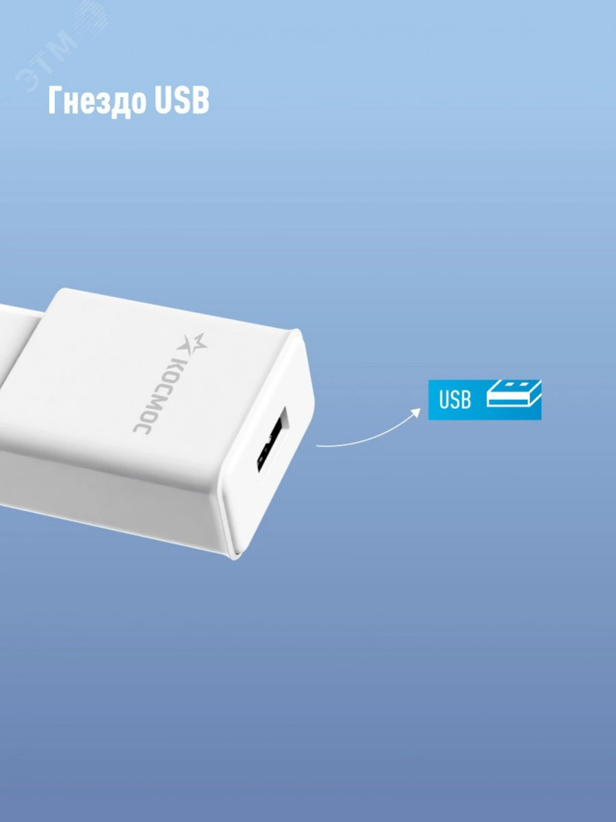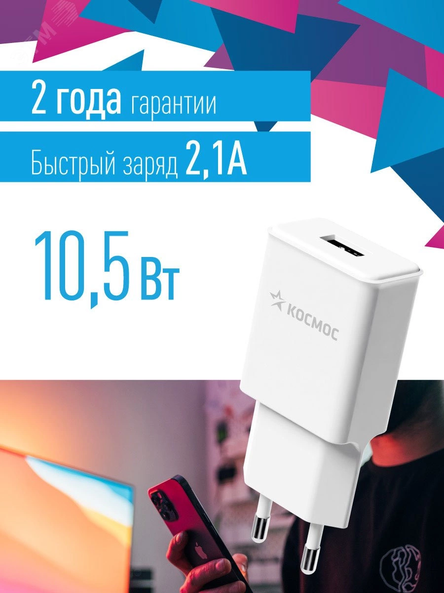 Сетевое зарядное устройство с разъемом USB и мощностью 10,5 Вт. Ток заряда 2,1А позволяет заряжать современные гаджеты с питанием от напряжения 5В.