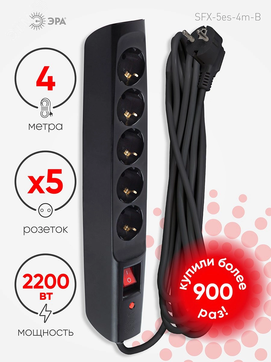 Полное описание: Сетевой фильтр SFX-5es-2m-W с надежной защитой с заземлением с выключателем 5 розеток 2м 10А белый