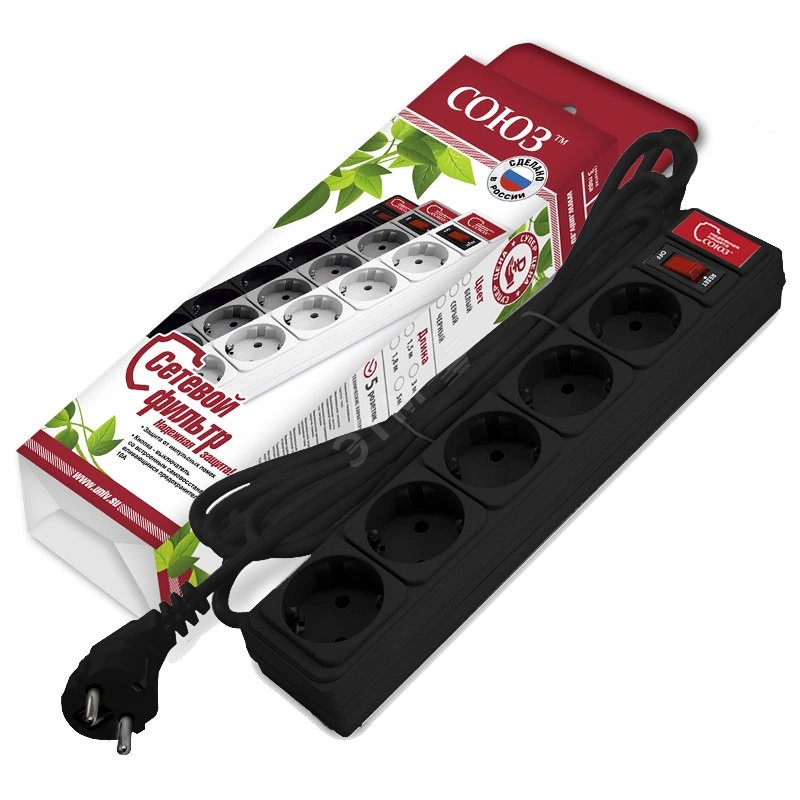 Полное описание: Сетевой фильтр ''СОЮЗ'' ПВС 3*0,75 5гн., 3м, выкл ючатель с индикацией, с/з, черный, премиум упаковка