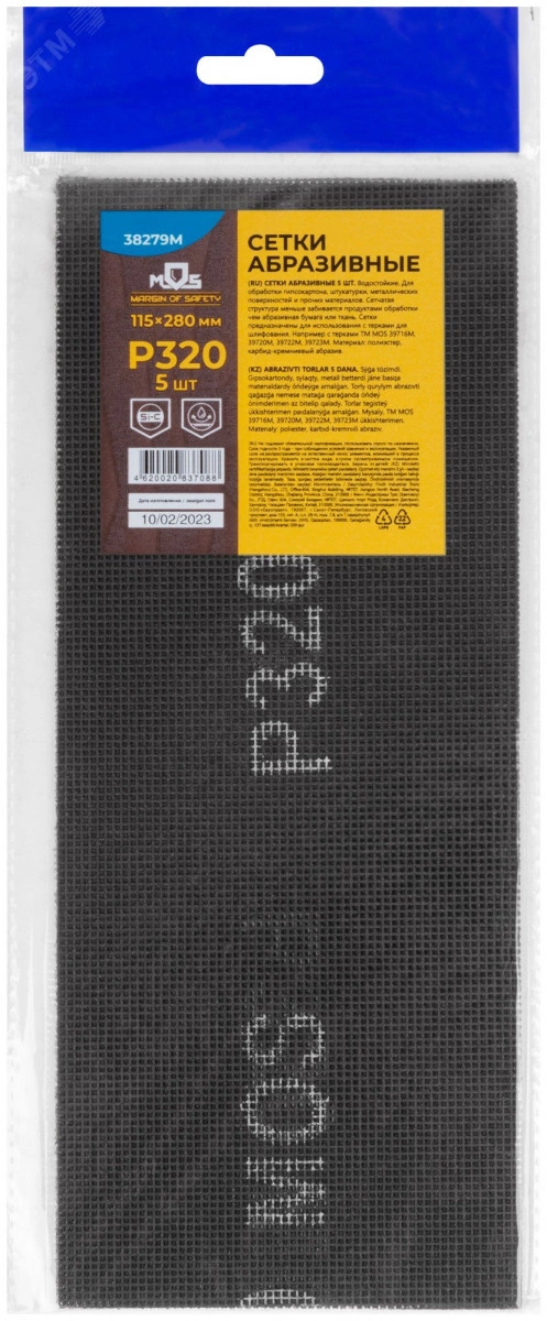 Набор 5 шт. Водостойкие. 115 х 280 мм. Для обработки гипсокартона, штукатурки, металлических поверхностей и прочих материалов. Сетчатая структура меньше забивается продуктами обработки чем абразивная бумага или ткань. Сетки предназначены для использования с терками для шлифования. Материал - полиэфирная ткань, карбид-кремниевый абразив. Упаковка - пакет с подвесом.