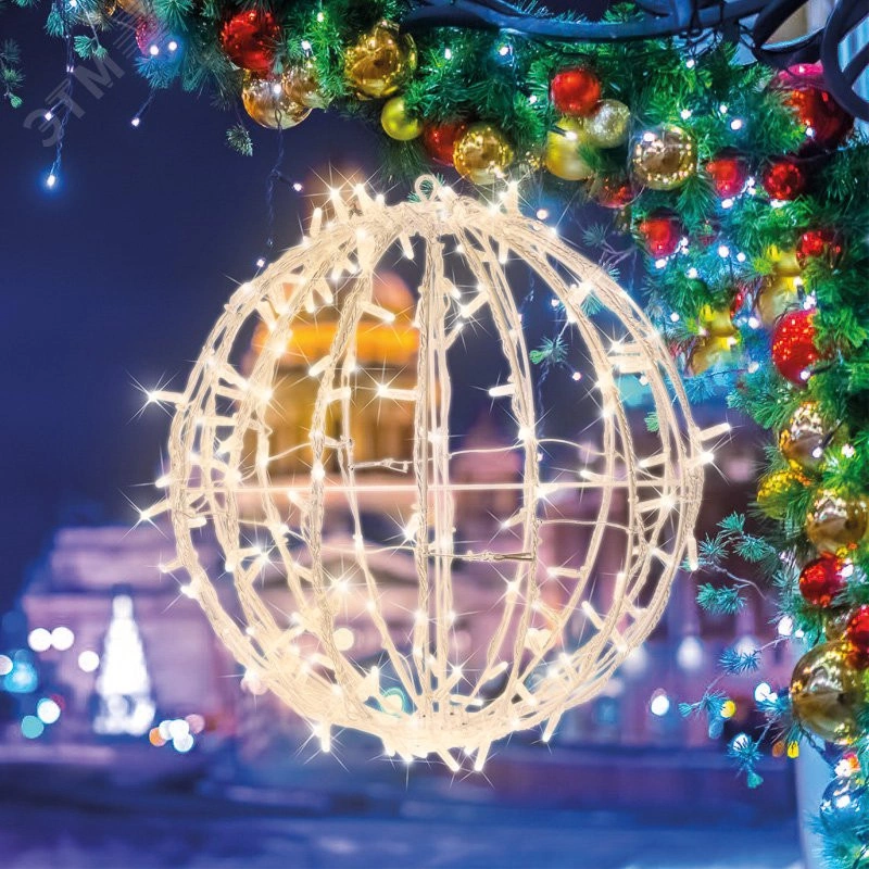 Шар светодиодный используется для оформления праздничных интерьеров жилых и общественных зданий, развлекательных комплексов. Может быть использован на открытых пространствах, в качестве украшения новогодних елей, установленных в местах народных гуляний. Световая фигура на каркасной основе, питание 220-240 В, диаметр 120 см, 600 светодиодов, каждый 5-й диод мерцает, цвет теплый белый.