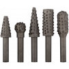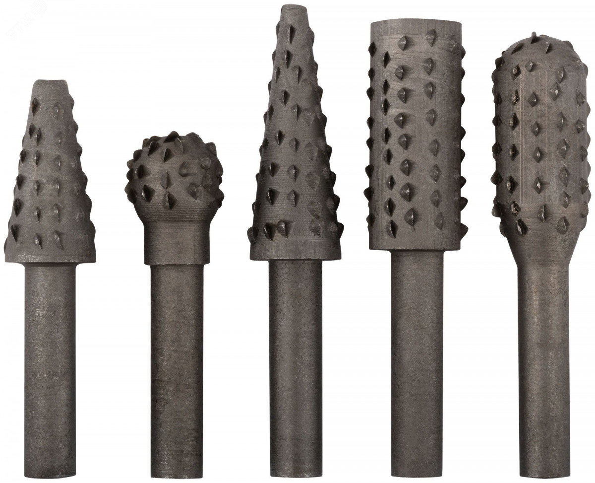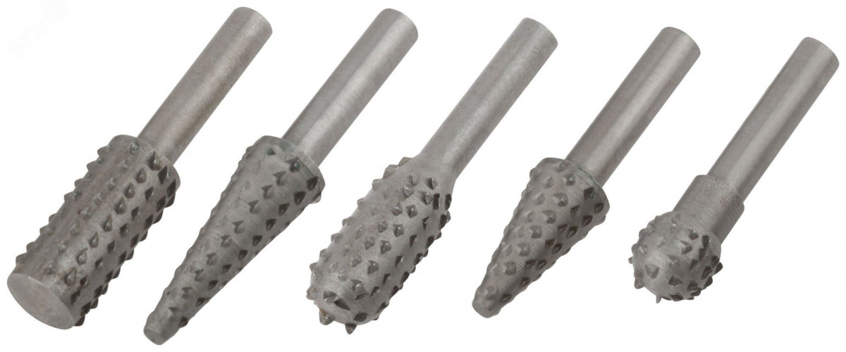 Насечки рашпильного типа обеспечивают высокую скорость и эффективность работы|5 различных форм насадок дают возможность выполенения широкого спектра операций|Цилиндрический хвостовик совместим с большинством типов патронов|Черненое покрытие предотвра