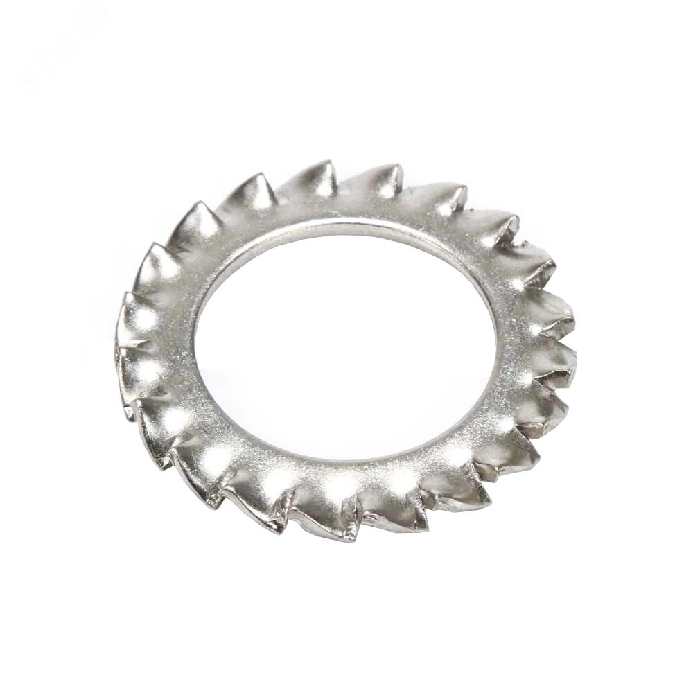 Шайба стопорная DIN 6798, форма А – с наружными насеченными зубьями, Конструкция шайбы позволяет увеличить прижимную площадь крепежа и значительно снизить вероятность самопроизвольного откручивания резьбового соединения. Шайба изготовлена из нержавеющей стали А2, что позволяет использовать ее во влажной среде, поскольку эта сталь обладает высокой коррозионной стойкостью. Используется совместно с болтами, винтами, резьбовыми шпильками и штифтами с соответствующим диаметром резьбы. При установке шайбы важно контролировать затягивающее усилие, иначе зубцы станут плоскими и не будут выполнять стопорящую функцию.