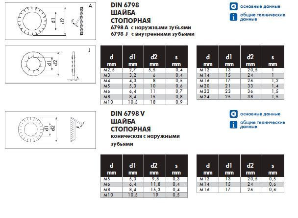 DIN 6798A представляет собой стопорную шайбу с насечками для крепежа номинального размера - от М2,2 до М31. По её наружному диаметру проходят острые отогнутые зубья, имеющие повышенную упругость. Применяется совместно с деталями, находящимся под постоянным воздействием вибраций и выполненных из пластмассы, дерева, алюминиевых сплавов, меди.
