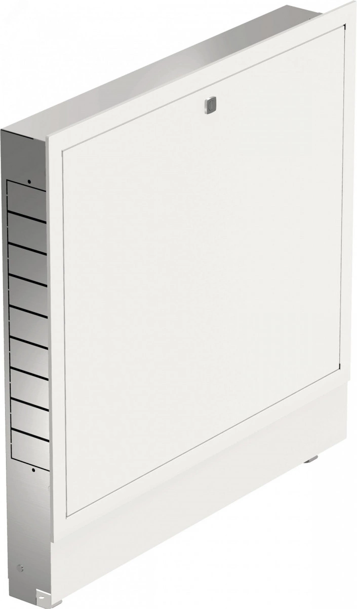 Для установки коллекторов, контроллеров и насосно-смесительных блоков на универсальных фиксирующих направляющих, включающих комплект крепежей. Изготовлен из оцинкованной стали. Все видимые части окрашены порошковой краской в белый цвет (RAL 9016). Ширина шкафов (без рамки) - 550-1300 мм. Монтажная глубина шкафа (регулируемая) - 110-150 мм. Монтажная высота шкафа (регулируемая) - 730-930 мм. Высота конструкции пола макс. 185 мм.