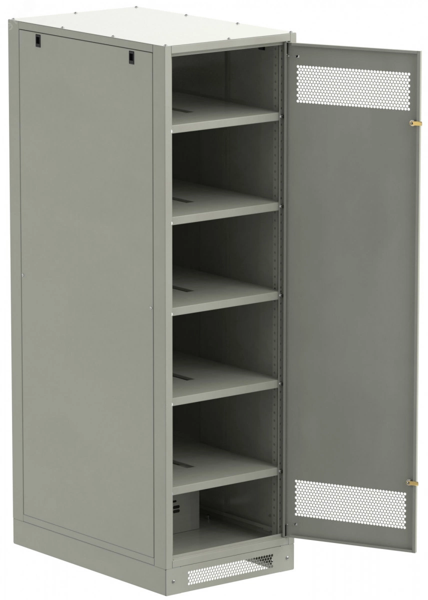Шкаф аккумуляторный серии LINEA B предназначен для размещения и защиты от несанкционированного доступа аккумуляторных батарей (АБ). Шкафы LINEA B повышенной прочности со сварным каркасом и усиленными полками позволяют размещать АБ до 500 кг. на полке. Вместе со шкафом поставляются полки. Количество полок в комплекте зависит от высоты шкафа. Каркас позволяет размещать полки с шагом 30мм. В полках предусмотрены вырезы для удобства соединения АБ. В нижней части корпуса предусмотрена плата для установки предохранителя-выключателя-разъединителя ПВР. Шкаф аккумуляторный серии LINEA B двухсекционный поставляется на цоколе высотой 100мм. и состоит их двух секций. В месте эксплуатации требуется соединение секций метизами из комплекта поставки. Все металлические части шкафа LINEA B заземлены.
