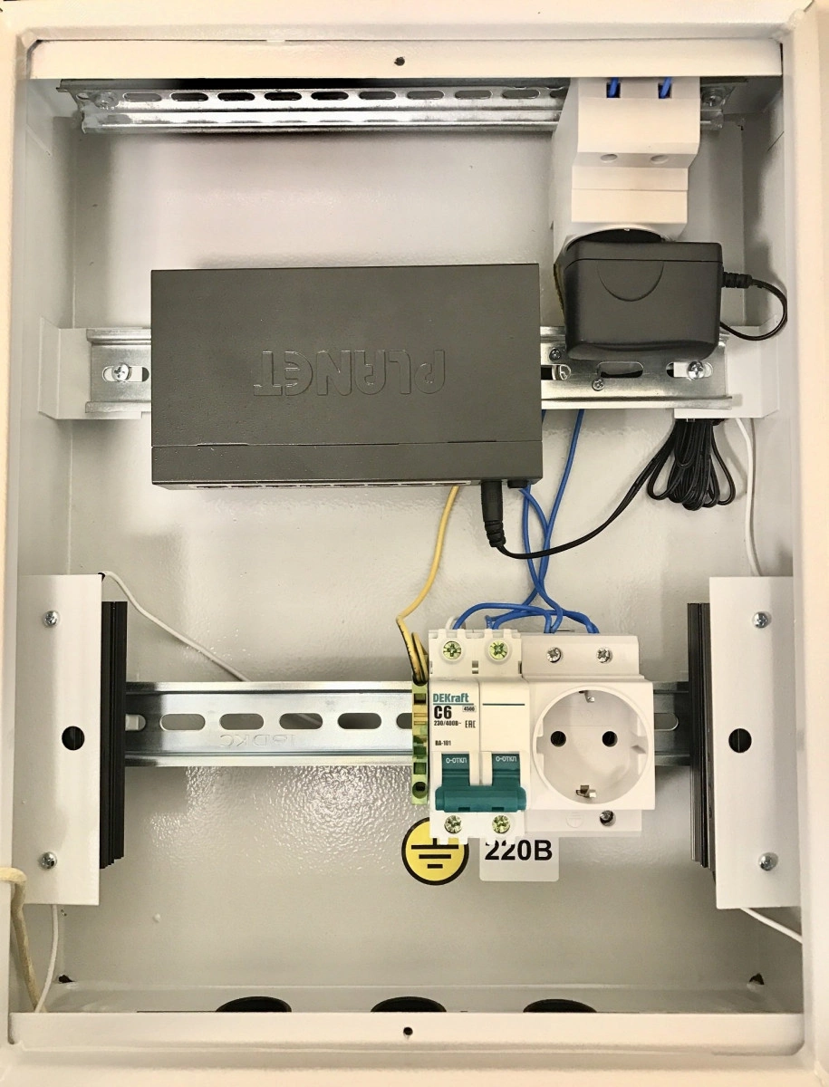 Электромонтажный шкаф B-400x310x120-FSD8 со встроенным неуправляемым 8-портовым коммутатором и блоком питания, предназначен для защиты от неблагоприятных воздействий окружающей среды размещенного в нем оборудования системы видеонаблюдения. По запросу, в электромонтажный шкаф может быть установлено дополнительное оборудование. Например, модемы, медиаконвертеры и т.д.