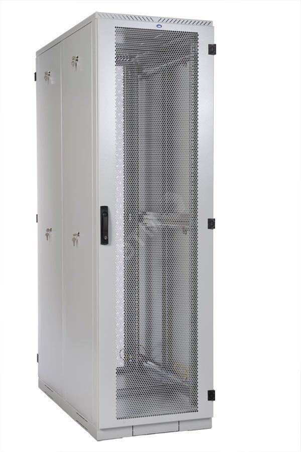 Шкаф серии ШТК-С предназначен для размещения серверного оборудования, организации центров хранения и обработки данных. Шкаф имеет усиленную конструкцию. Включает две сварные рамы, соединенные комплектом швеллеров, основание и крышу. Легок в сборке. Распределенная вертикальная нагрузка до 1000 кг. Шкаф стандартно комплектуется одинарными или двойными перфорированными дверями с ригельными замками и боковыми стенками. Одинарные двери имеют как правую, так и левую навеску, угол открытия 180 градусов. Боковые стенки в зависимости от комплектации двойные или одинарные, фиксируются точечными замками. Доступ для монтажа, коммутации и обслуживания возможен с четырех сторон, через боковые легкосъемные стенки, переднюю и заднюю двери. Шкаф имеет 4 оцинкованные вертикальные направляющие, регулируемые по глубине. Кабельные вводы находятся в основании и крыше шкафа.