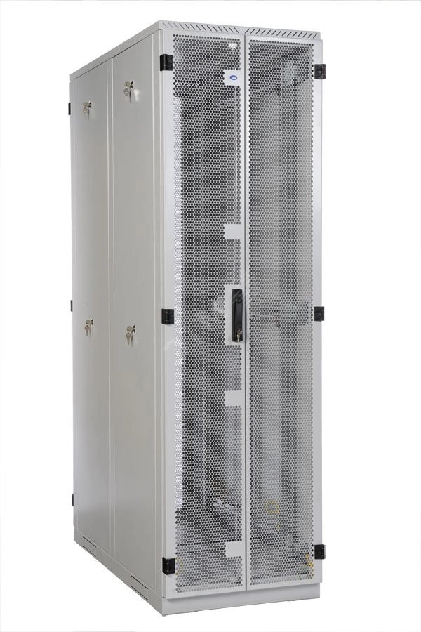 Шкаф серии ШТК-С предназначен для размещения серверного оборудования, организации центров хранения и обработки данных. Шкаф имеет усиленную конструкцию. Включает две сварные рамы, соединенные комплектом швеллеров, основание и крышу. Легок в сборке. Распределенная вертикальная нагрузка до 1000 кг. Шкаф стандартно комплектуется одинарными или двойными перфорированными дверями с ригельными замками и боковыми стенками. Одинарные двери имеют как правую, так и левую навеску, угол открытия 180 градусов. Стенки надежно фиксируются точечными замками. Доступ для монтажа, коммутации и обслуживания возможен с четырех сторон, через боковые легкосъемные стенки, переднюю и заднюю двери. Шкаф имеет 4 оцинкованные вертикальные направляющие, регулируемые по глубине. Кабельные вводы находятся в основании и крыше шкафа.