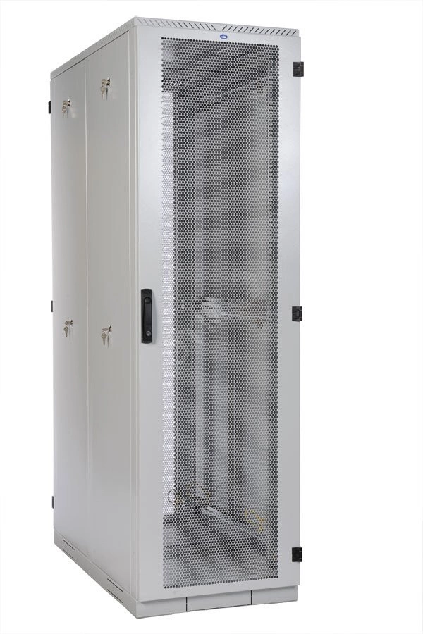 Шкаф серии ШТК-С предназначен для размещения серверного оборудования, организации центров хранения и обработки данных. Шкаф имеет усиленную конструкцию. Включает две сварные рамы, соединенные комплектом швеллеров, основание и крышу. Легок в сборке. Распределенная вертикальная нагрузка до 1000 кг. Шкаф стандартно комплектуется одинарными или двойными перфорированными дверями с ригельными замками и боковыми стенками. Одинарные двери имеют как правую, так и левую навеску, угол открытия 180 градусов. Стенки надежно фиксируются точечными замками. Доступ для монтажа, коммутации и обслуживания возможен с четырех сторон, через боковые легкосъемные стенки, переднюю и заднюю двери. Шкаф имеет 4 оцинкованные вертикальные направляющие, регулируемые по глубине. Кабельные вводы находятся в основании и крыше шкафа.