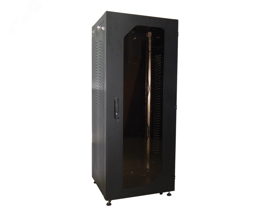Шкаф телекоммуникационный 19'' напольный 32U чёрный на 8 приборов ТШ-326060Ч8 (RAL 9005, 600x600, полезная глубина 535мм, дверь стекло, в комплекте вентиляторный блок с проводом и вилкой 220В, термостат, кронштейн, два блока розеток на 8 гнезд, 8 полок, 8 фальш панелей, ролики, метизы, провода заземления)