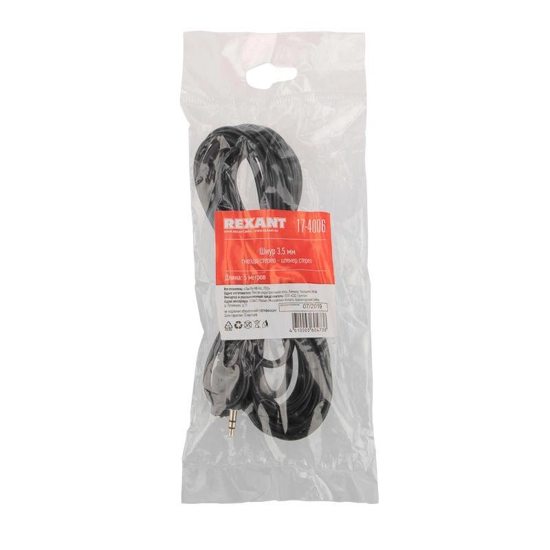 Шнур 3.5 мм гнездо стерео - 3.5 мм штекер стерео 5 м REхANT предназначен для передачи аналогового аудиосигнала и широко применяется в любых акустических системах. С одной стороны шнура располагается штекер разъема 3.5 мм Stereo, а с другой — гнездо разъема 3.5 мм Stereo.