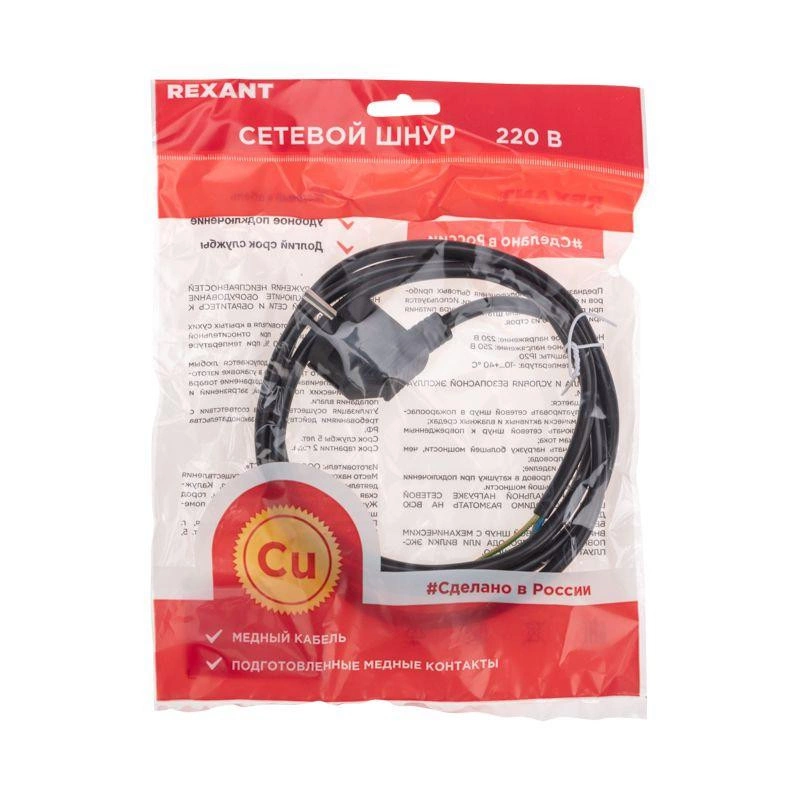 Полное описание: Шнур электрический с угловой вилкой 10А 2500Вт ПВС 3х1.0кв.мм 5м черн. Rexant 11-1322