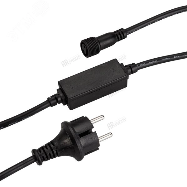 Шнур питания для моноцветных светодиодных гирлянд ШАРИКИ, НИТЬ постоянного свечения. Материал оболочки ПВХ. В комплект входит - шнур питания с вилкой европейского стандарта, разъём подключения к гирлянде, выпрямитель AC/DC. Цвет провода чёрный. Длина провода 1.5 метра.