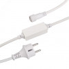 Шнур питания для светодиодных гирлянд постоянного свечения. Материал оболочки РЕЗИНА (каучук). Цвет провода белый. В комплект входит - шнур питания с вилкой европейского стандарта (IP44), 2pin разъём подключения к гирлянде, выпрямитель AC/DC (1.6A). Длина провода 1.5 метра.