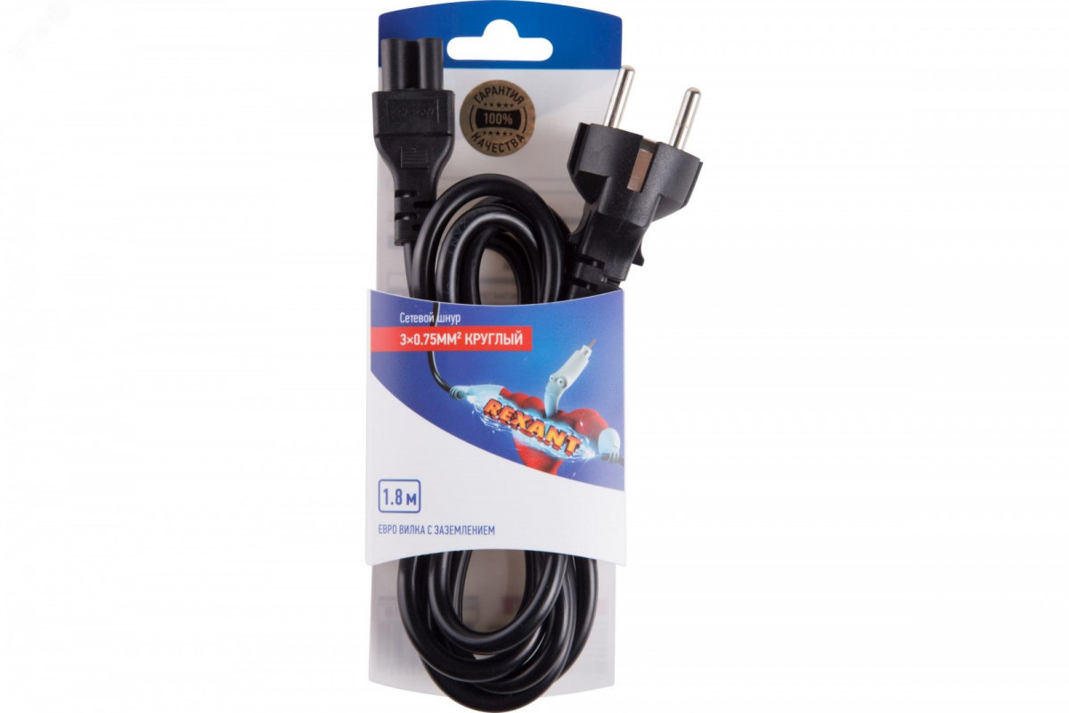 Шнур сетевой Евро 3х0.75кв.мм 1.8М (PVC) (с заземлением) (ноутбук) REXANT предназначен для подключения к сети переменного тока (AC) с напряжением 220B портативных компьютеров, ноутбуков, проекторов и других устройств, имеющих штыревой разъём типа C6. Данный шнур сетевой Евро (IEC cord) оснащен с одной стороны неразборной литой вилкой (евростандарт) с заземляющим контактом, с другой литым трёх контактным гнездовым разъёмом типа C5 (в обиходе называют ''Микки Маус'' или листом клевера) и трехжильным проводом с сечением жил 0.75кв.мм. Основные характеристики- тип вилки Евро, тип розетки IEC (С5), максимальная сила тока 10А, изоляция жил и общая оболочка изготовлена из ПВХ, длина провода 1.8 метра.