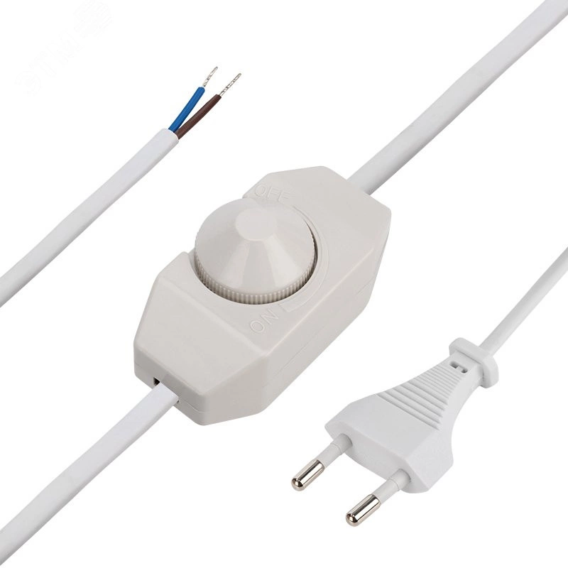 Сетевой шнур с диммером предназначен для подключения бытовых приборов, осветительной техники и т. д. Шнур состоит из провода ШВВП сечением 0,75 мм2, укомплектованного литой неразборной плоской вилкой (Евро), номинальным током 2,5 А, с подготовленными (зачищенными и лужеными) контактами, посередине провода расположен диммер в корпусе из ABC пластика.