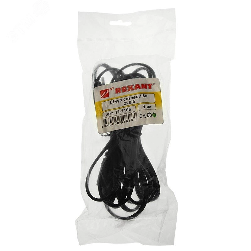Шнур сетевой 5 м 2х0.5 мм2 REXANT предназначен для подключения к сети переменного тока (AC) с напряжением 220 B аудио- и видеоаппаратуры, источников питания ноутбуков, игровых консолей и других приборов, имеющих штыревой сетевой разъем типа С8 (известен из-за его формы как ''восьмерка''). Данный сетевой шнур (IEC cord) состоит из двухжильного провода с сечением жил 0.5 мм2, с одной стороны литой неразборной плоской вилкой (евро) и с другой - литым гнездовым неполяризованным разъемом типа C7 (евроразъем).