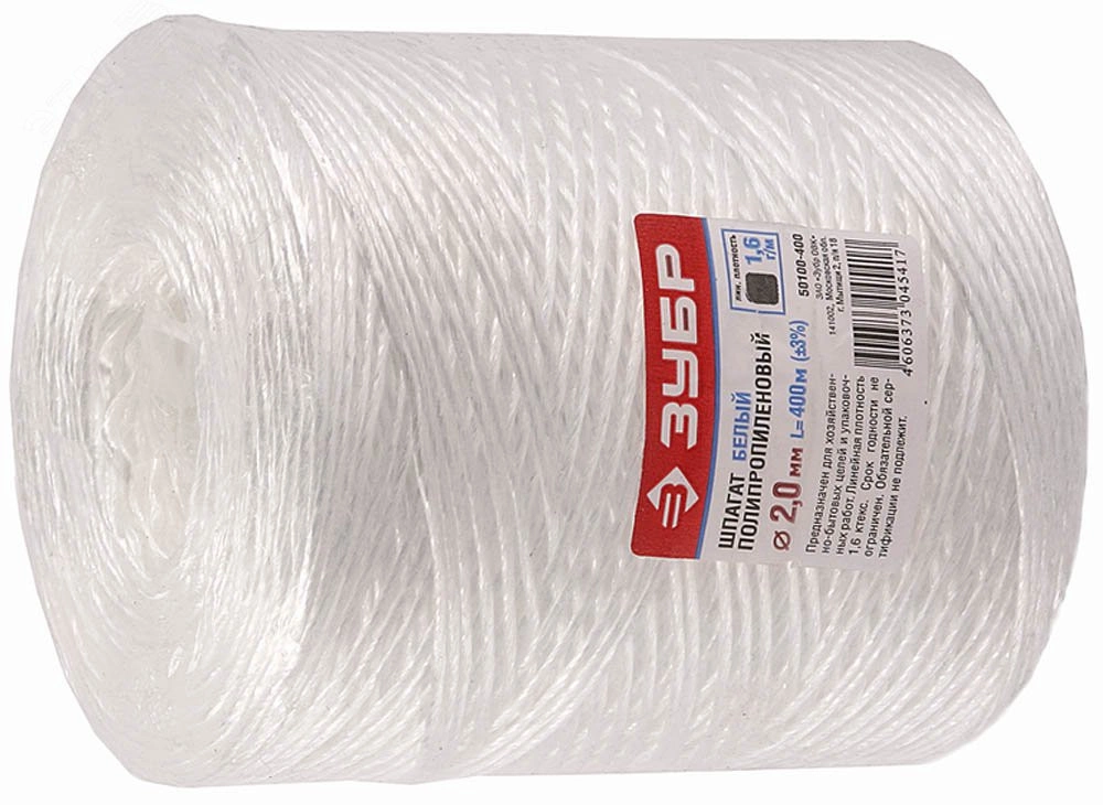 Многоцелевой полипропиленовый шпагат ЗУБР предназначен для хозяйственно-бытовых целей и упаковочных работ. Полипропиленовые волокна обладают отличной устойчивостью к действию щелочей, кислот и растворителей, многократным изгибам, гниению, воздействию биологических организмов, а также негигроскопичностью — полипропилен не впитывают влагу из воздуха, а также не меняет своих свойств при погружении в воду. Все вышеперечисленные характеристики определяют сферу применения полипропиленового шнура, который активно используется для упаковки грузов, в быту, туризме и спорте.