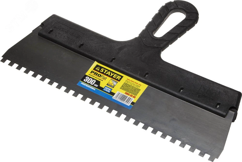 Благодаря зубчатой кромке шпатель идеально подходит для работы со строительными и клеевыми смесями, полотно из нержавеющей стали обеспечивает надежность и долгий срок службы, а удобная пластмассовая рукоятка создает условия для комфортной работы.