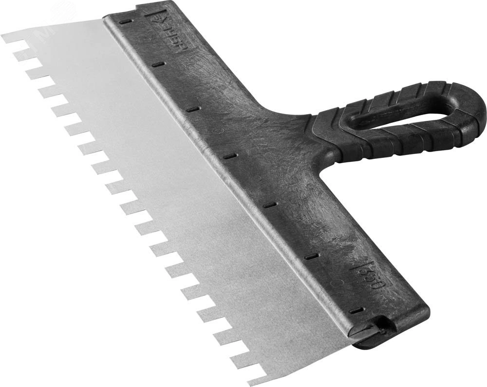 Благодаря зубчатой кромке шпатель идеально подходит для работы со строительными и клеевыми смесями, полотно из нержавеющей стали обеспечивает надежность и долгий срок службы инструмента, а удобная пластмассовая рукоятка создает условия для комфортной работы.