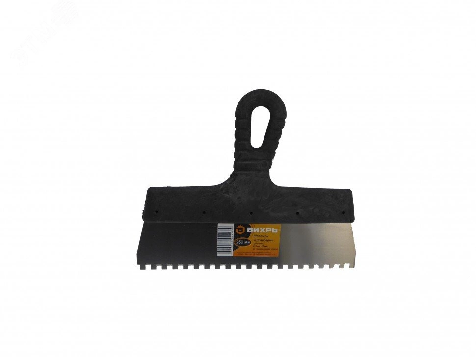 Шпатель зубчатый нерж.cталь пластиковая рукоятка 6х6 мм, 250мм Вихрь используется для отделочных работ- нанесения цементного раствора или плиточного клея на небольшую по площади поверхность. Шпатель из нержавеющей cтали, шириной 250 мм. Рукоятка из прочного пластика, с изогнутой ручкой. Шаг зуба 6х6.