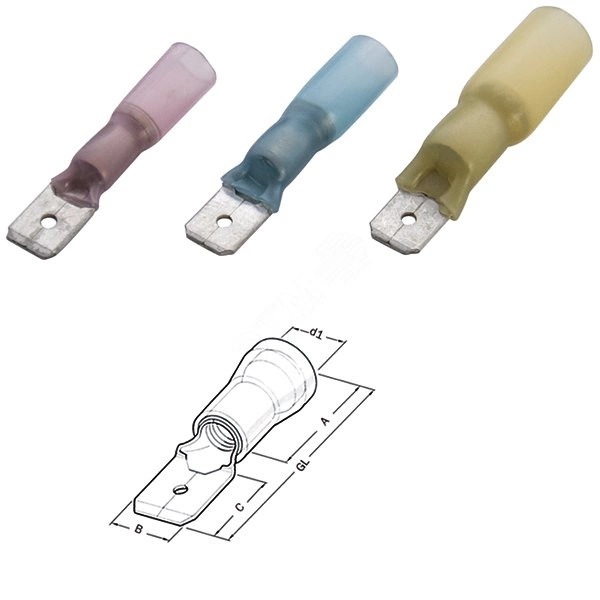Наконечник для опрессовки гибких медных проводов и последующего соединения с плоской штепсельной гильзой. Материал - латунь. Электролитическое оловянное покрытие для минимального сопротивления и защиты от коррозии. Внутренние насечки для надежной фиксации на проводе. Изоляция - полиолефин. Термоусадочная изоляция с клеевым слоем создает герметичное соединение, которое защищено от воздействий внешней среды.