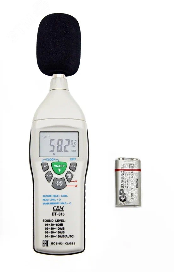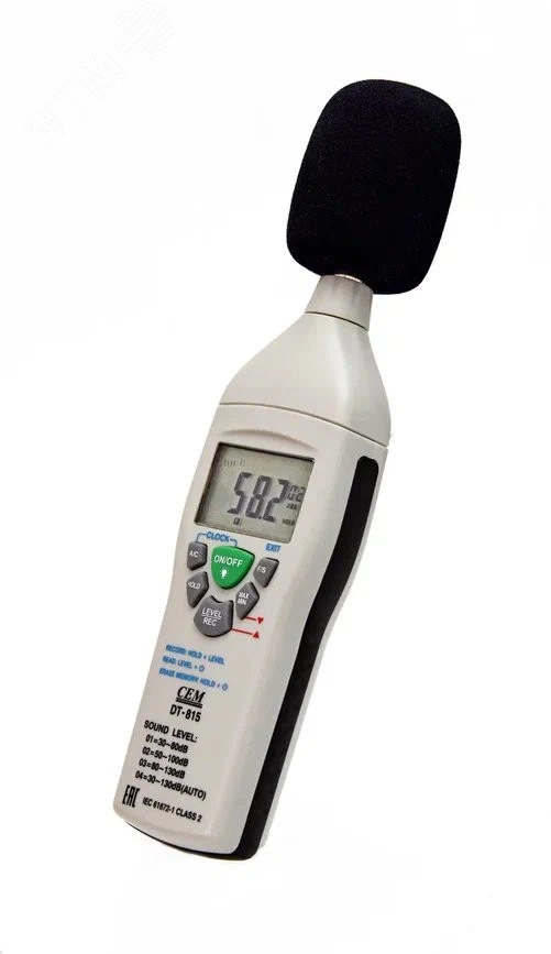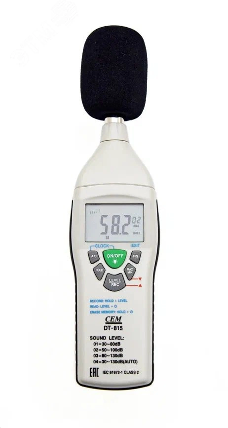 Современный компактный дизайн. Индикация верхнего и нижнего пределов измерений. Весовые фильтры - A и C. Время интегрирования - 125мс (FAST) и 1с (SLOW). Соответствие стандарту IEC61672-1 Type 2. Определение максимальных и минимальных. Удержание показаний DATA HOLD. Графическая шкала. Подсветка дисплея. Память на 50 значений.