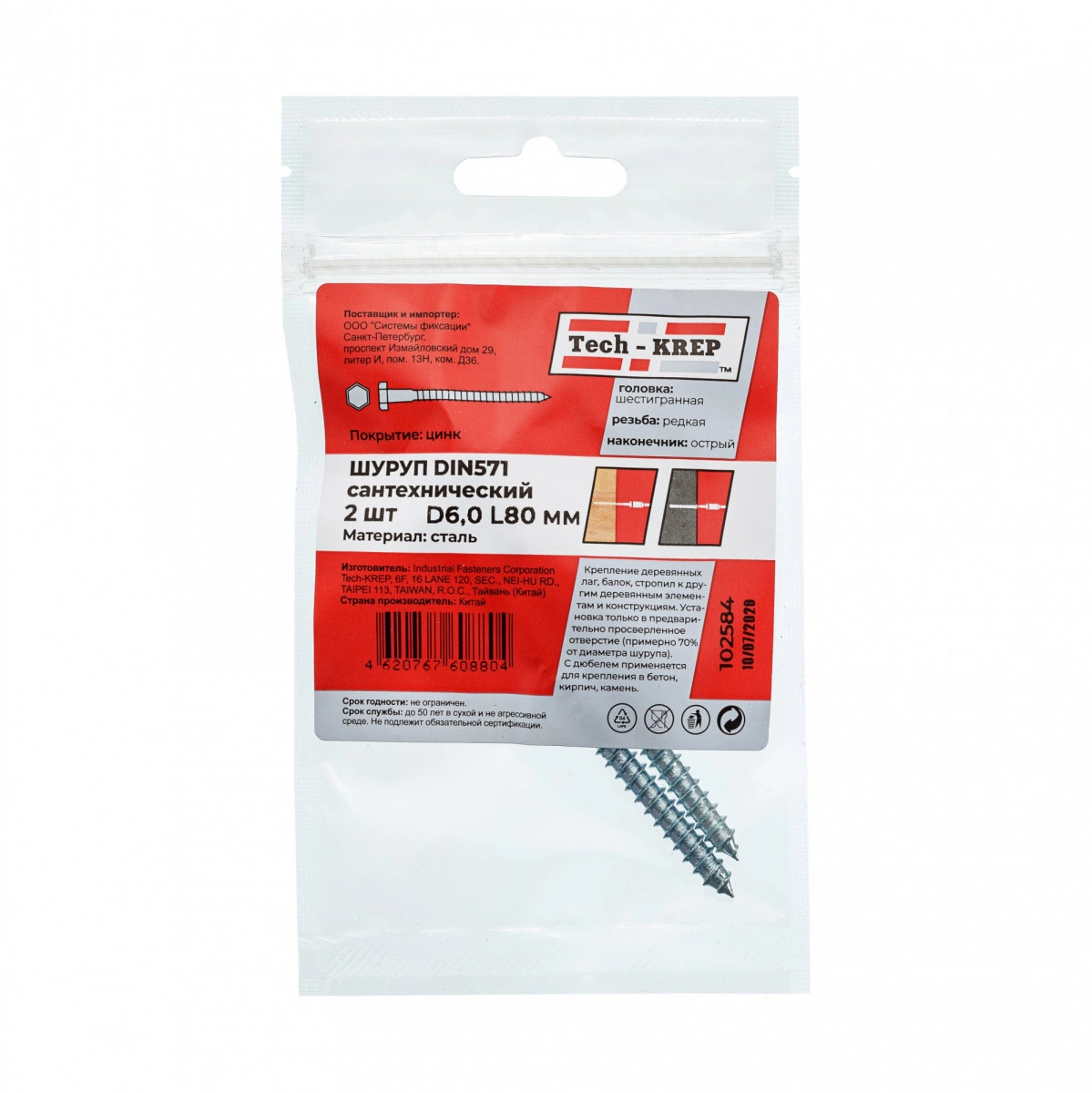 Шуруп DIN571 6х80 сантехнический, шестигранная головка (2шт) - пакет (102584)