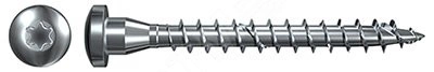 Шуруп изготавливается из нержавеющей стали, что делает возможным применение данного метиза при проведении работ вне помещений. Восковое покрытие, наносимое на готовое изделие, существенно облегчает работу с ним. Изделие имеет полупотайную головку, то есть после монтажа головка немного выступает над поверхностью. Полная резьба гарантирует плотное соединение по всей длине изделия.