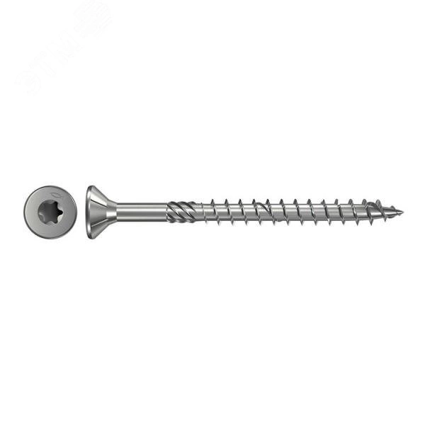 Шуруп изготавливается из нержавеющей стали, что делает возможным применение данного метиза при проведении работ вне помещений. Восковое покрытие, наносимое на готовое изделие, существенно облегчает работу с ним. Изделие имеет полупотайную головку, то есть после монтажа головка немного выступает над поверхностью. Полная резьба гарантирует плотное соединение по всей длине изделия.
