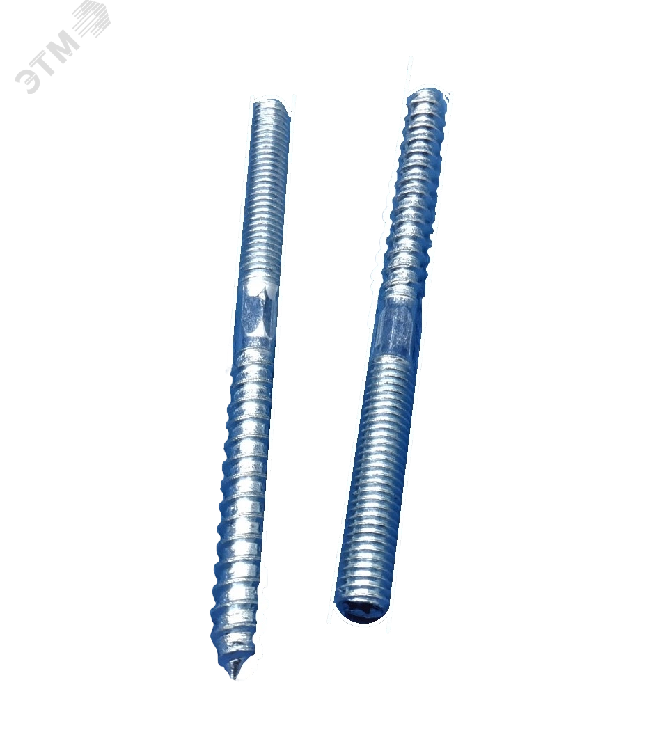 Представляет собой стержень, на остроконечную часть которого нанесена винтовая резьба, а на тупоконечную - метрическая. На плоском торце сделан шлиц (TORX), посередине сделаны шесть граней, позволяющих закручивать шпильку обычным рожковым ключом. Материал - углеродистая сталь, покрытие - белый цинк, класс прочности - 4.8.