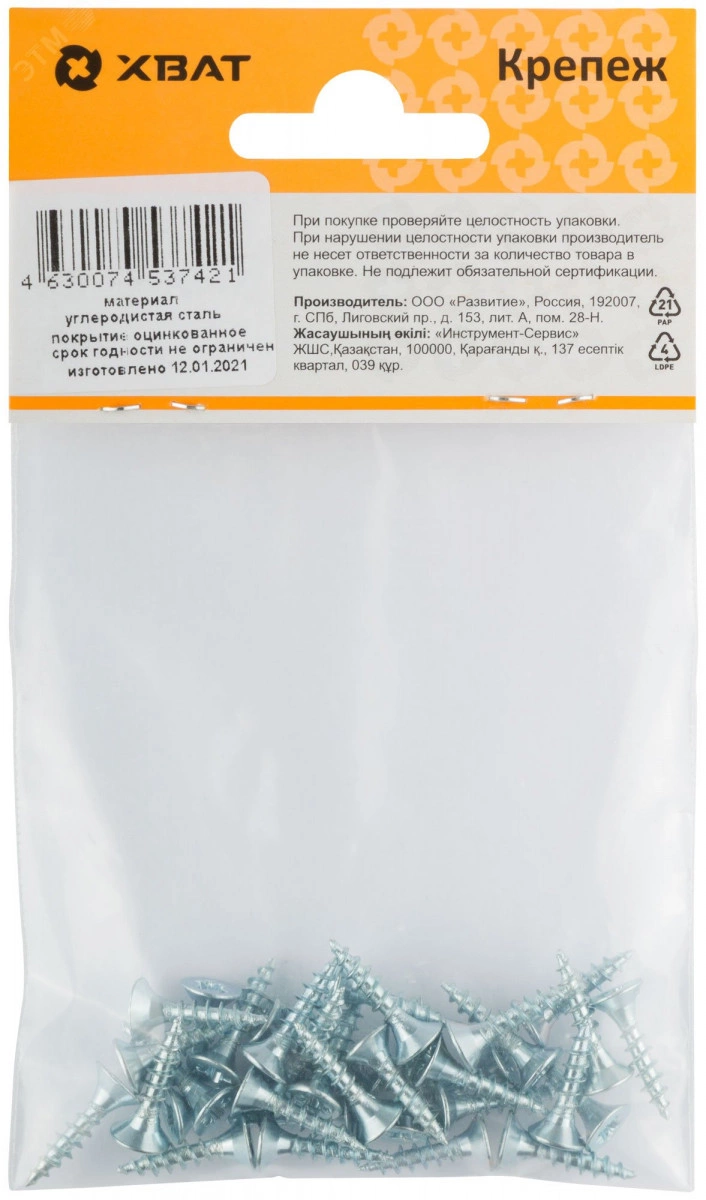 Саморез универсальный имеет потайную головку с крестообразным шлицем PZ, крупную накатанную резьбу и острый наконечник. Выполнен из углеродистой стали, покрытие – цинк.