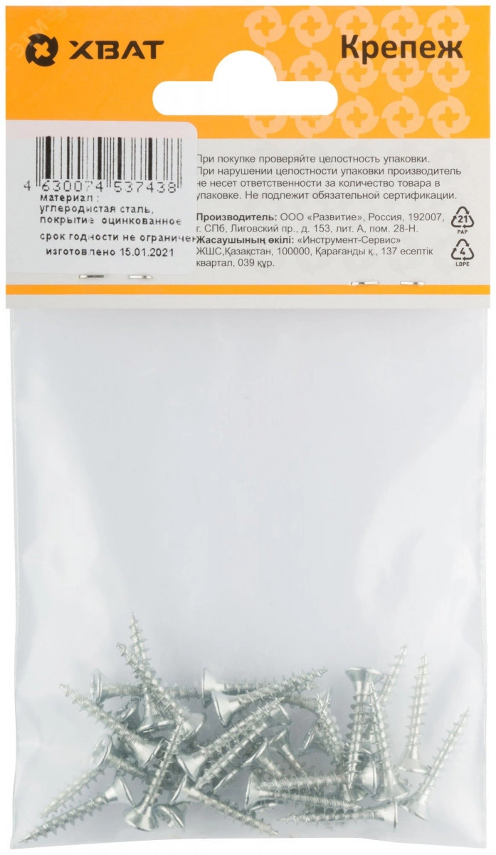 Саморез универсальный имеет потайную головку с крестообразным шлицем PZ, крупную накатанную резьбу и острый наконечник. Выполнен из углеродистой стали, покрытие – цинк.