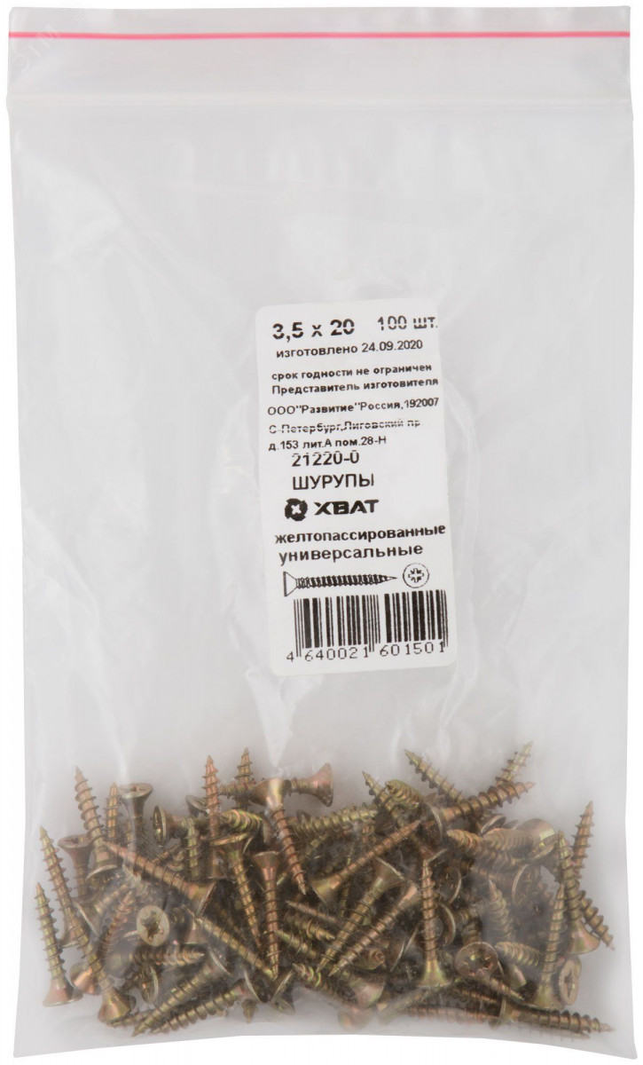 Шуруп универсальный 3,5х20 потайная головка, остроконечный, желтопассивированный (100шт)