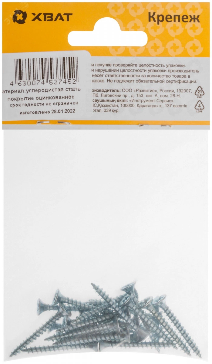 Саморез универсальный имеет потайную головку с крестообразным шлицем PZ, крупную накатанную резьбу и острый наконечник. Выполнен из углеродистой стали, покрытие – цинк.