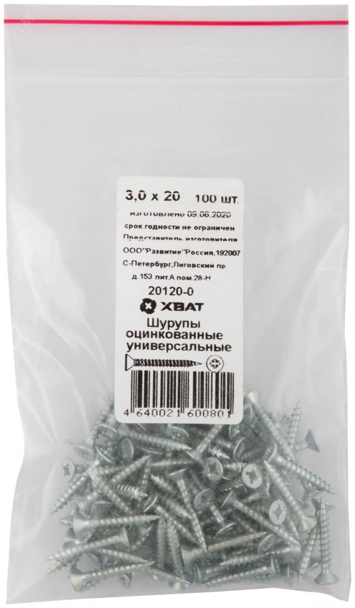 Шуруп универсальный 3х20 потайная головка, остроконечный, оцинкованный (100шт)
