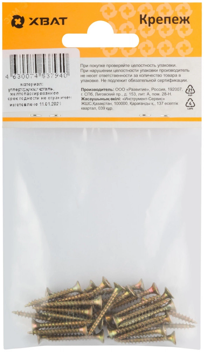 Саморез универсальный имеет потайную головку с крестообразным шлицем PZ, крупную накатанную резьбу и острый наконечник. Выполнен из углеродистой стали, покрытие – желтый цинк.