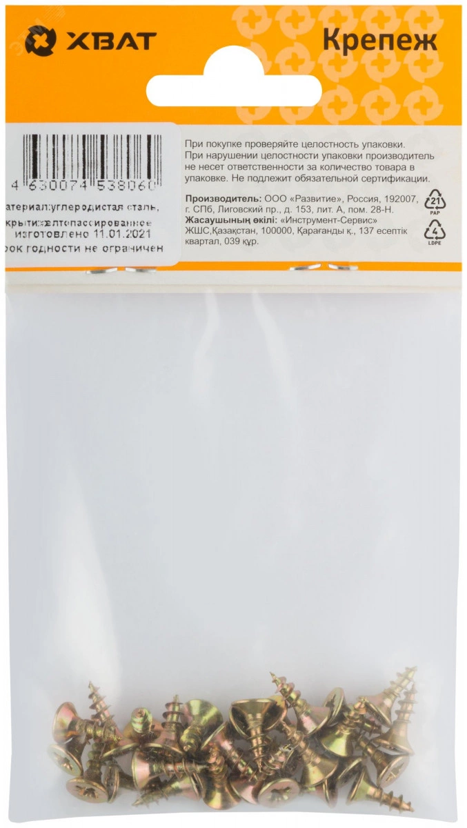 Саморез универсальный имеет потайную головку с крестообразным шлицем PZ, крупную накатанную резьбу и острый наконечник. Выполнен из углеродистой стали, покрытие – желтый цинк.