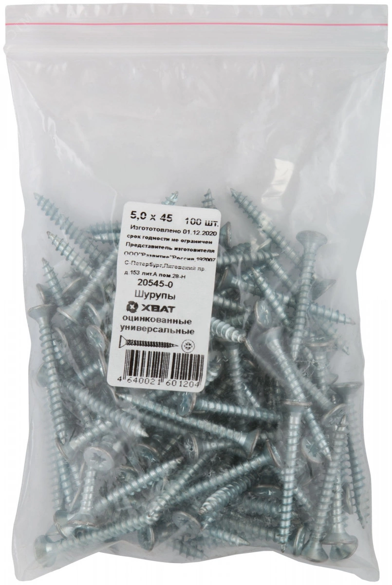 Шуруп универсальный 5х45 потайная головка, остроконечный, оцинкованный (100шт)