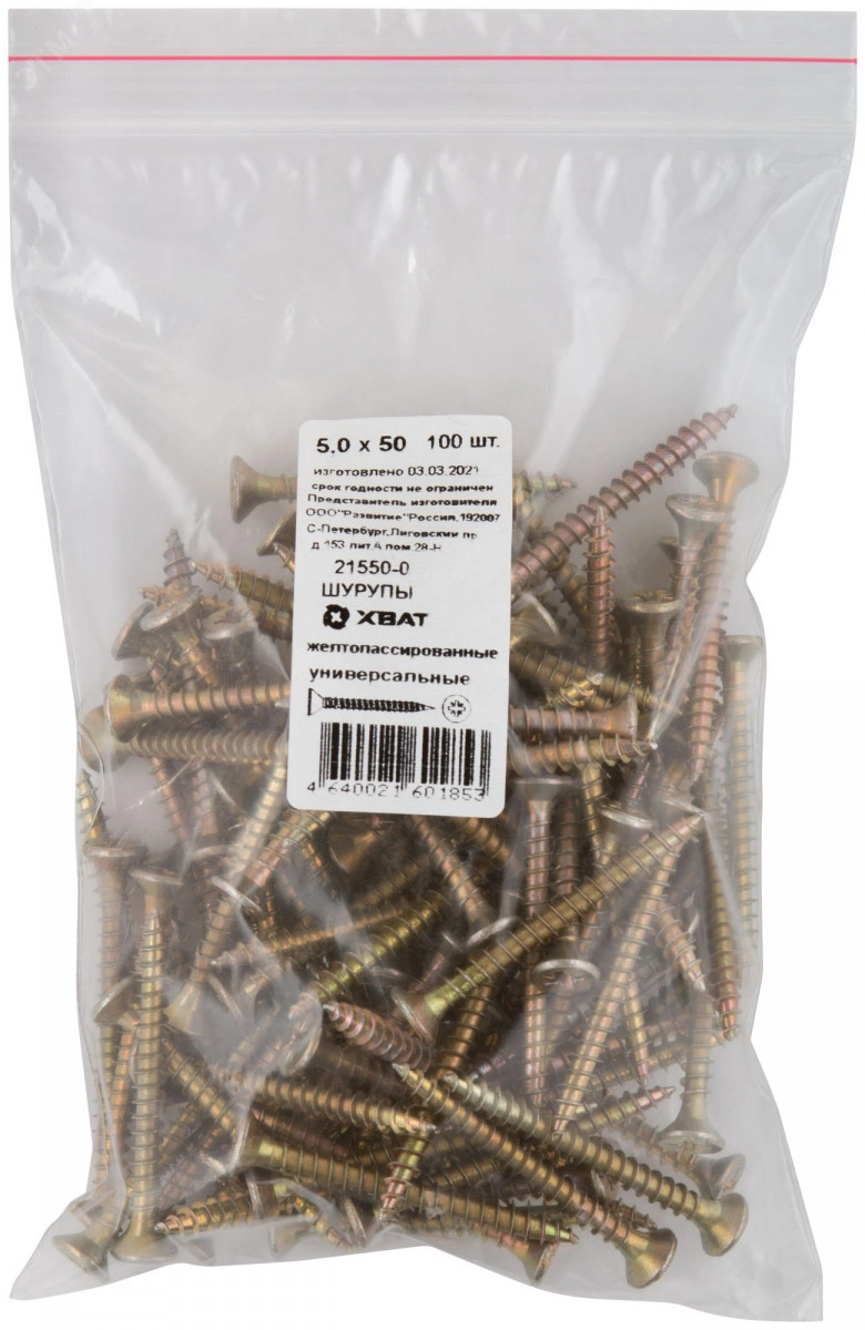 Шуруп универсальный 5х50 потайная головка, остроконечный, желтопассивированный (100шт)