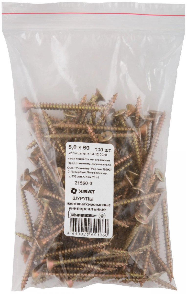 Шуруп универсальный 5х60 потайная головка, остроконечный, желтопассивированный (100шт)