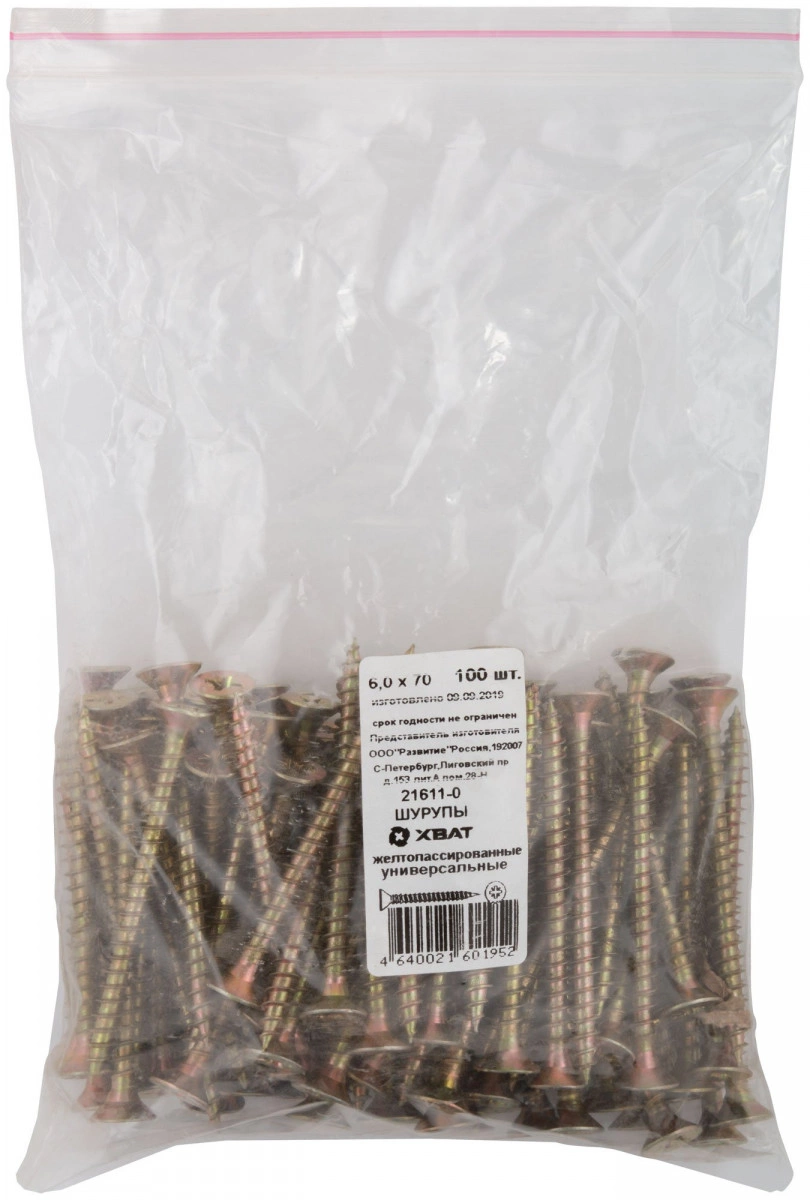 Шуруп универсальный 6х70 потайная головка, остроконечный, желтопассивированный (100шт)